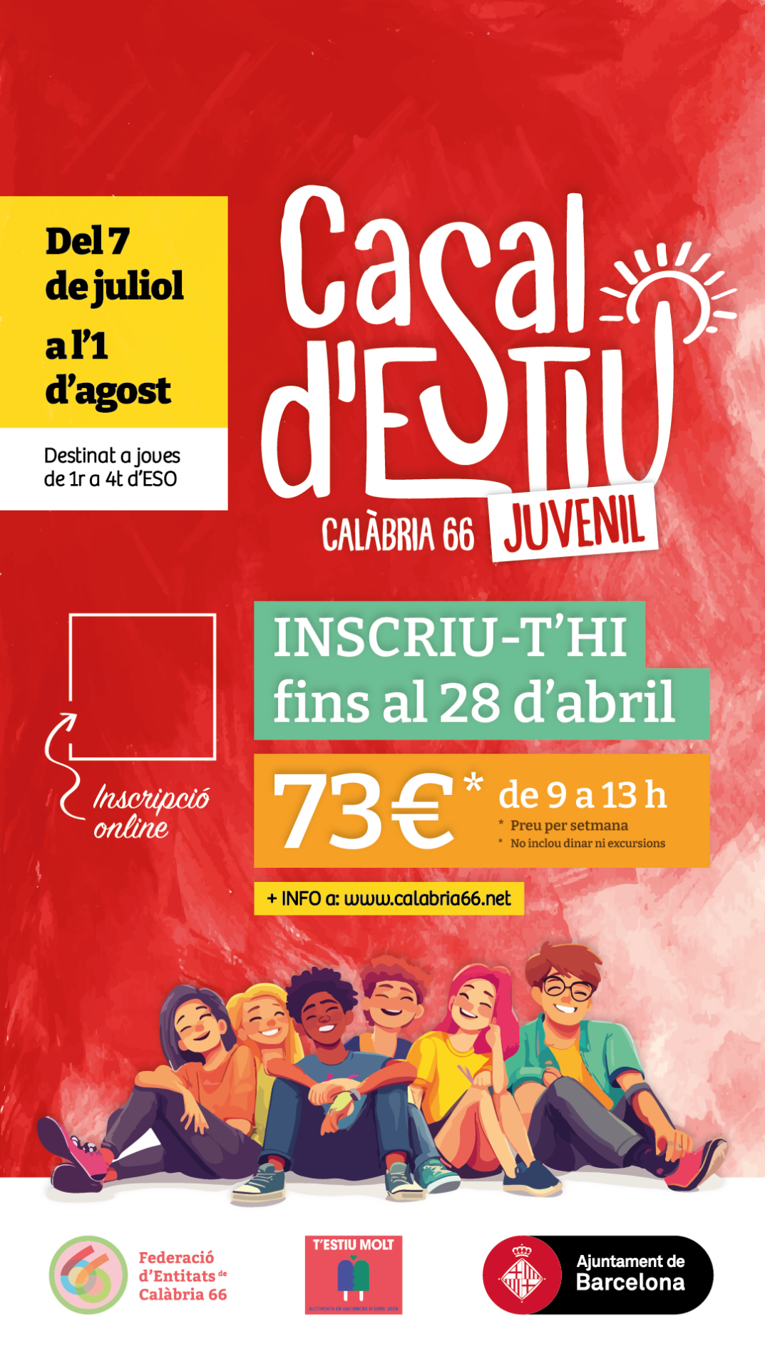 El Casal Juvenil de Calàbria 66 és un espai pensat per a joves de 1r a 4t d'ESO, que proposa un centre d’interès atractiu combinat amb activitats innovadores escollides pel mateix grup. Gimcanes, tallers, visites culturals, excursions i projectes socials de barri són alguns dels exemples…