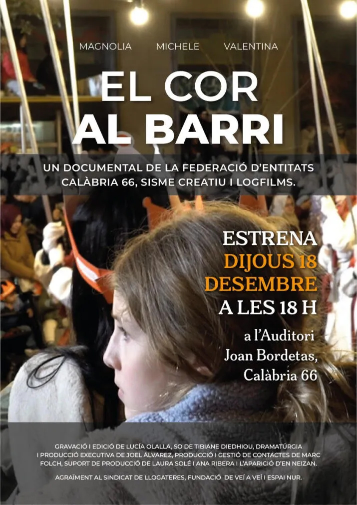 “El Cor al Barri” és també una experiència d’acompanyament creatiu audiovisual i emocional que posa al centre les vivències i els relats de les veïnes, donant veu a mares, fills i filles del barri per visibilitzar l’impacte emocional que té la violència immobiliària i la crisi d’habitatge en la seva vida quotidiana. Es tracta d’una producció de la Federació d’Entitats de Calàbria 66, Sisme Creatiu i LOG Films, que vol reforçar el paper de la comunitat davant una realitat que afecta cada vegada més famílies.