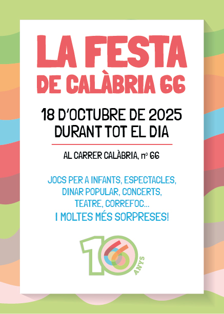 Calàbria 66 celebra enguany el seu desè aniversari com a espai comunitari de referència al districte de l’Eixample. Des de la seva obertura, aquest equipament s’ha consolidat com un punt de trobada per a entitats, col·lectius i veïns i veïnes que hi han trobat un lloc on desenvolupar projectes socials, culturals i educatius.