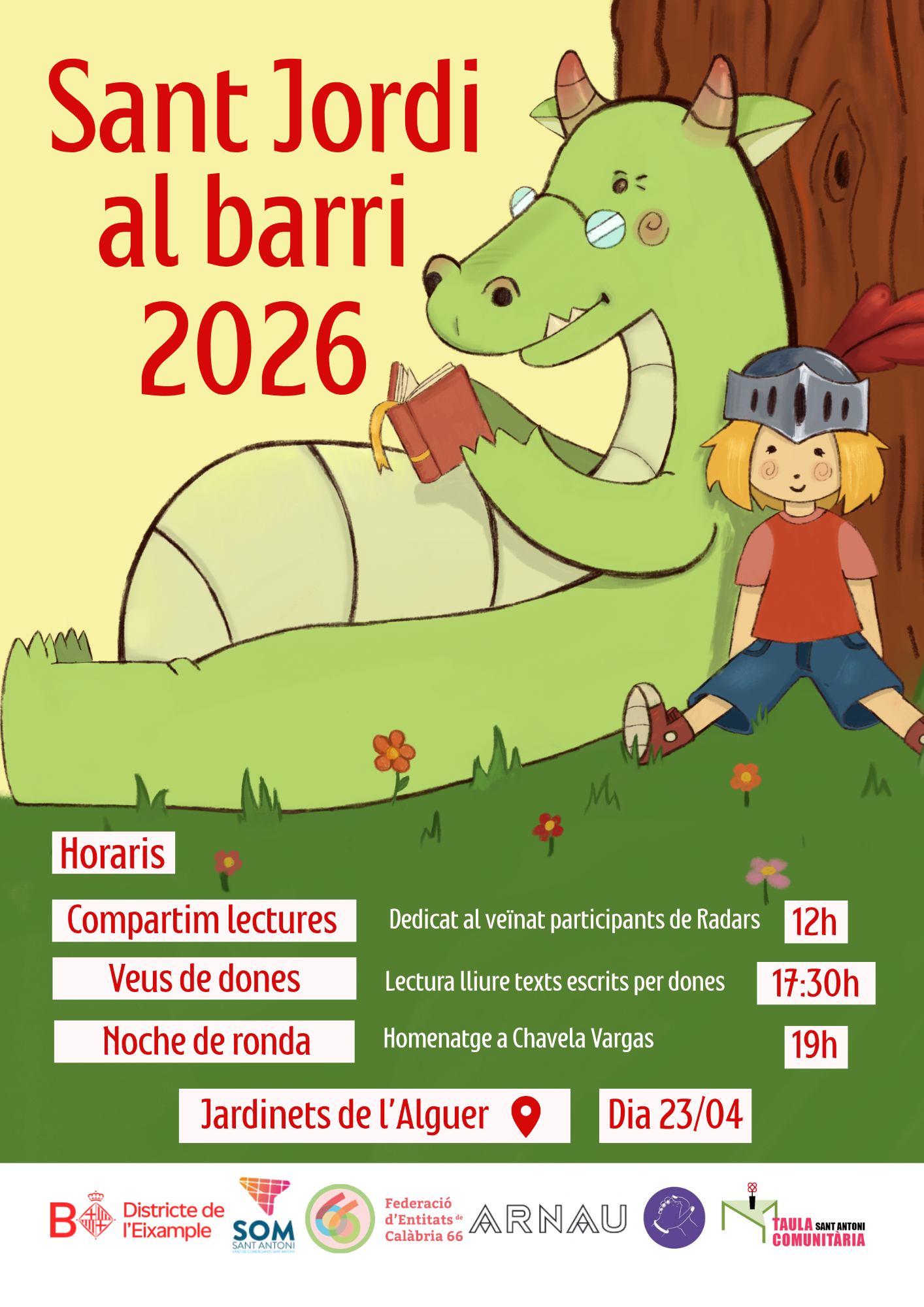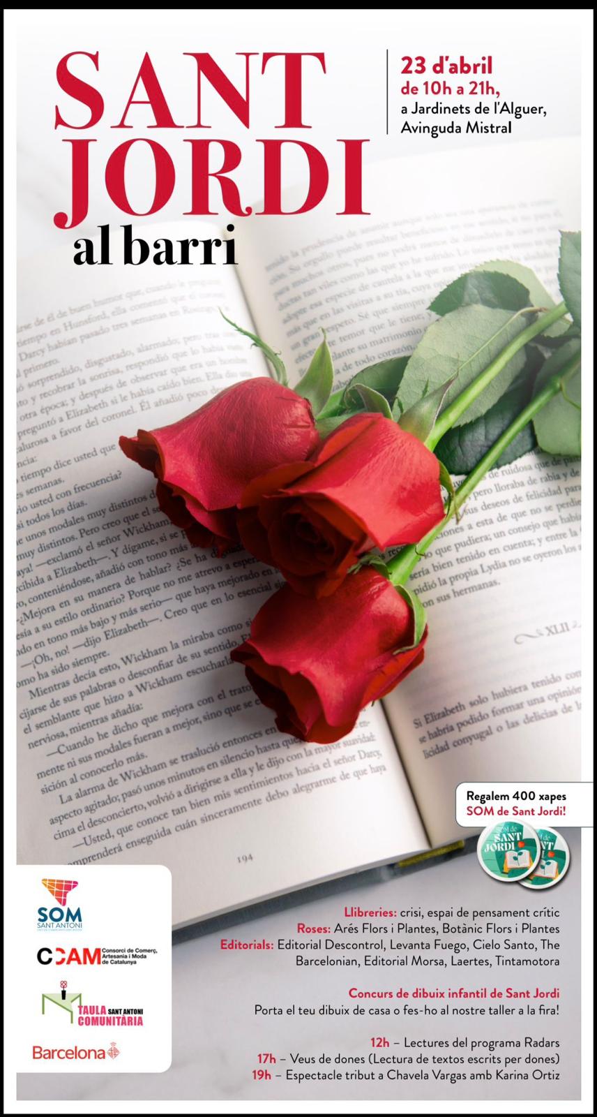 El mateix 23 d’abril, els Jardinets de l’Alguer (Av. Mistral) es convertiran en un altre dels epicentres de la diada al barri, amb una jornada de 10 a 21 h plena de llibres i activitat cultural.