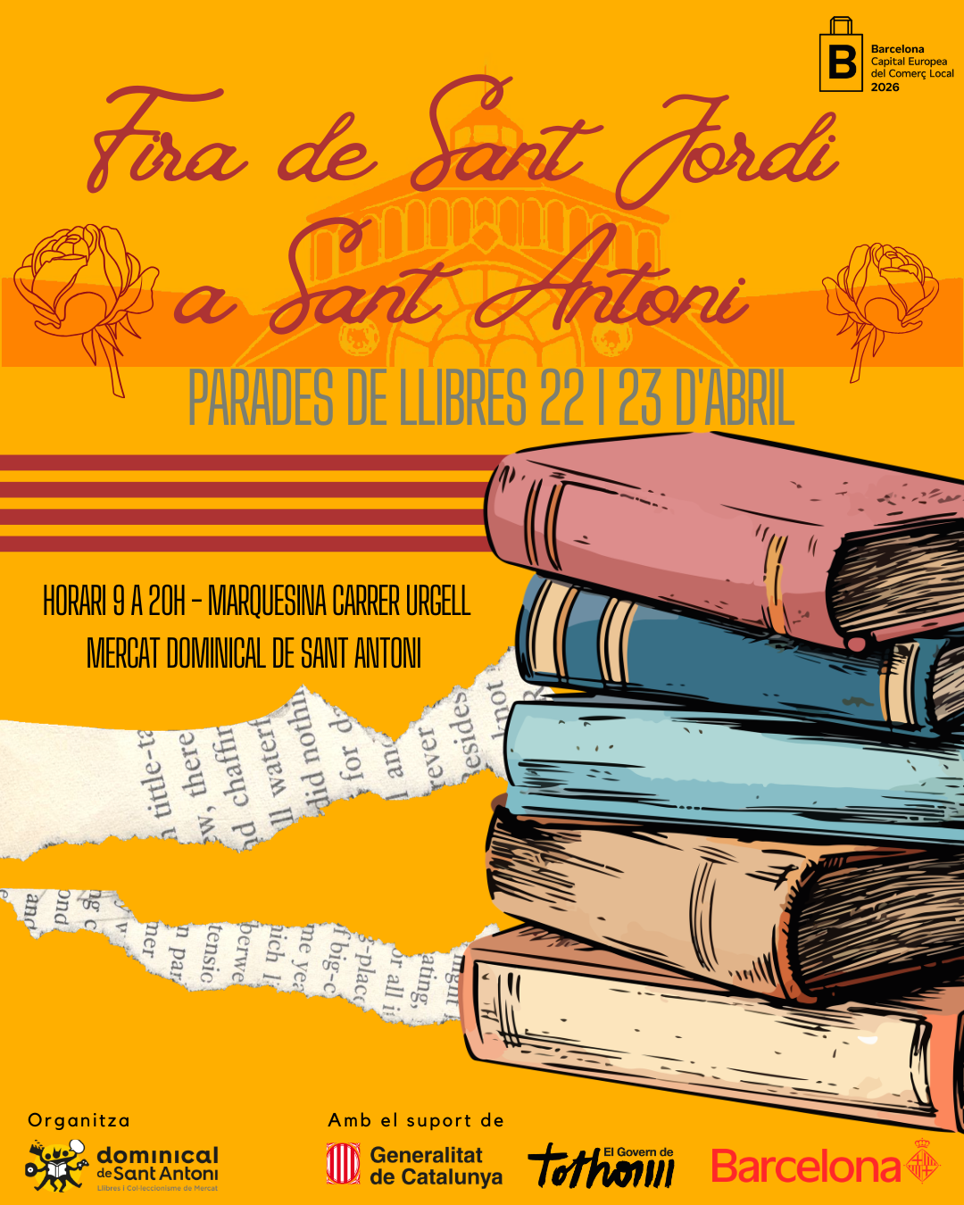 Durant els dies 22 i 23 d’abril, el Mercat del Llibre Dominical de Sant Antoni, a la marquesina del carrer Urgell del Mercat de Sant Antoni, acollirà una nova edició especial de Sant Jordi, de 9 a 20 h, amb parades de llibres i ambient festiu. Pots consultar més informació al seu web.